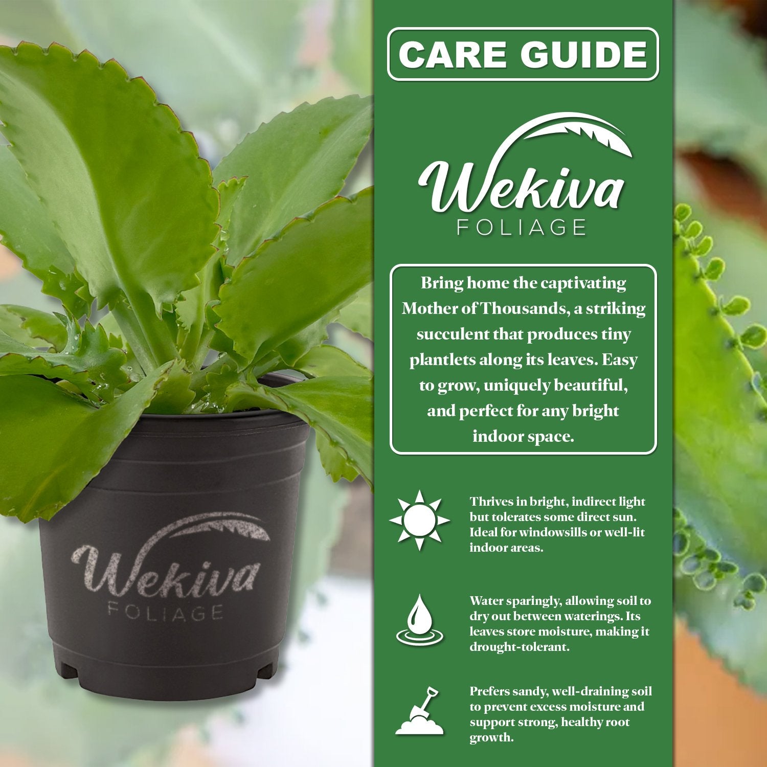 The Mother of Thousands (Kalanchoe daigremontiana) is a fascinating succulent that immediately captures attention with its distinctive and unique growth habit. Native to Madagascar, this plant is prized for the tiny plantlets that form along the edges of its long, lance-shaped leaves, giving it its memorable name. Each plantlet has the potential to develop into a new plant once it drops and takes root in the soil, making this species not only attractive but also highly prolific. Its upright stems can reach impressive heights when provided with the right conditions, often creating a striking vertical accent in both indoor and outdoor displays. The smooth, green leaves are speckled with subtle purple or brown markings, which adds to the plant’s visual interest and ornamental value.