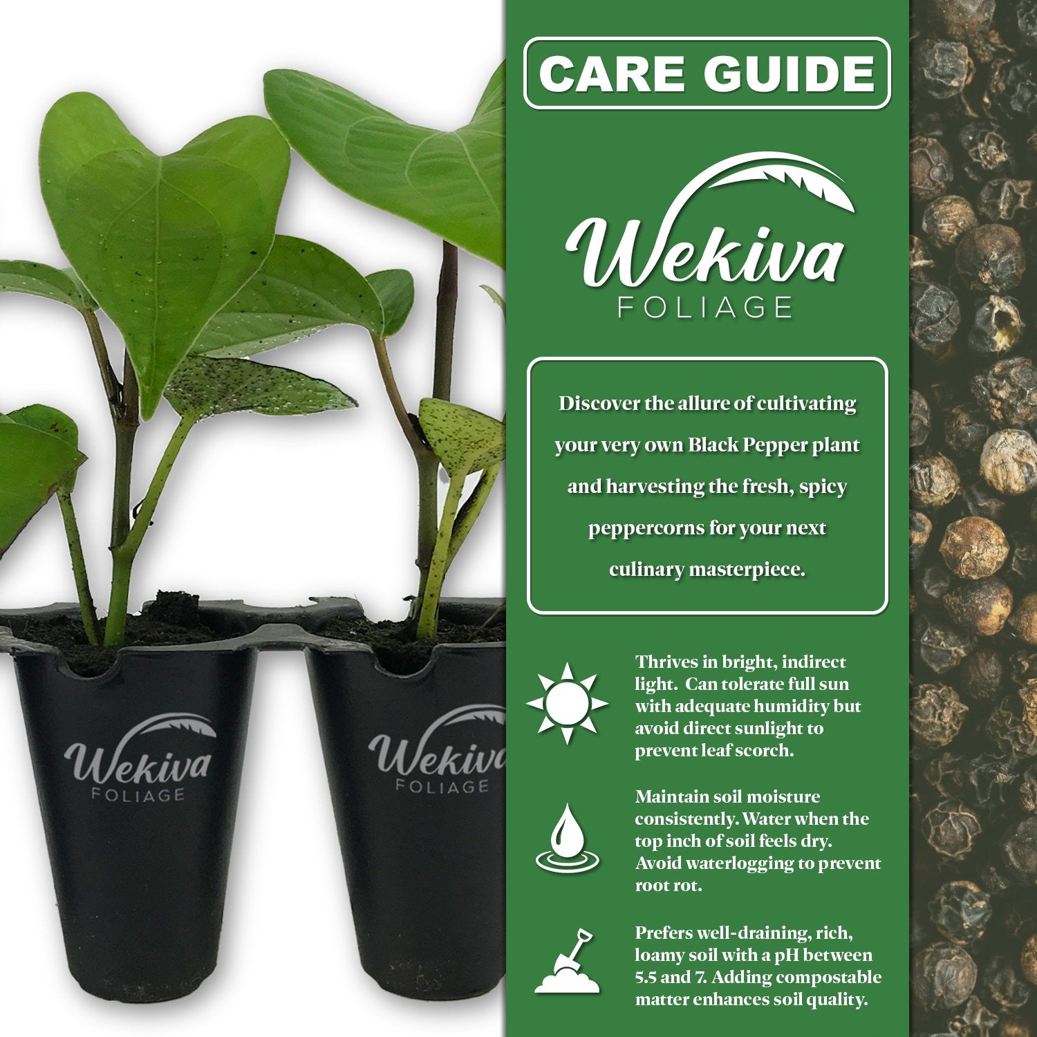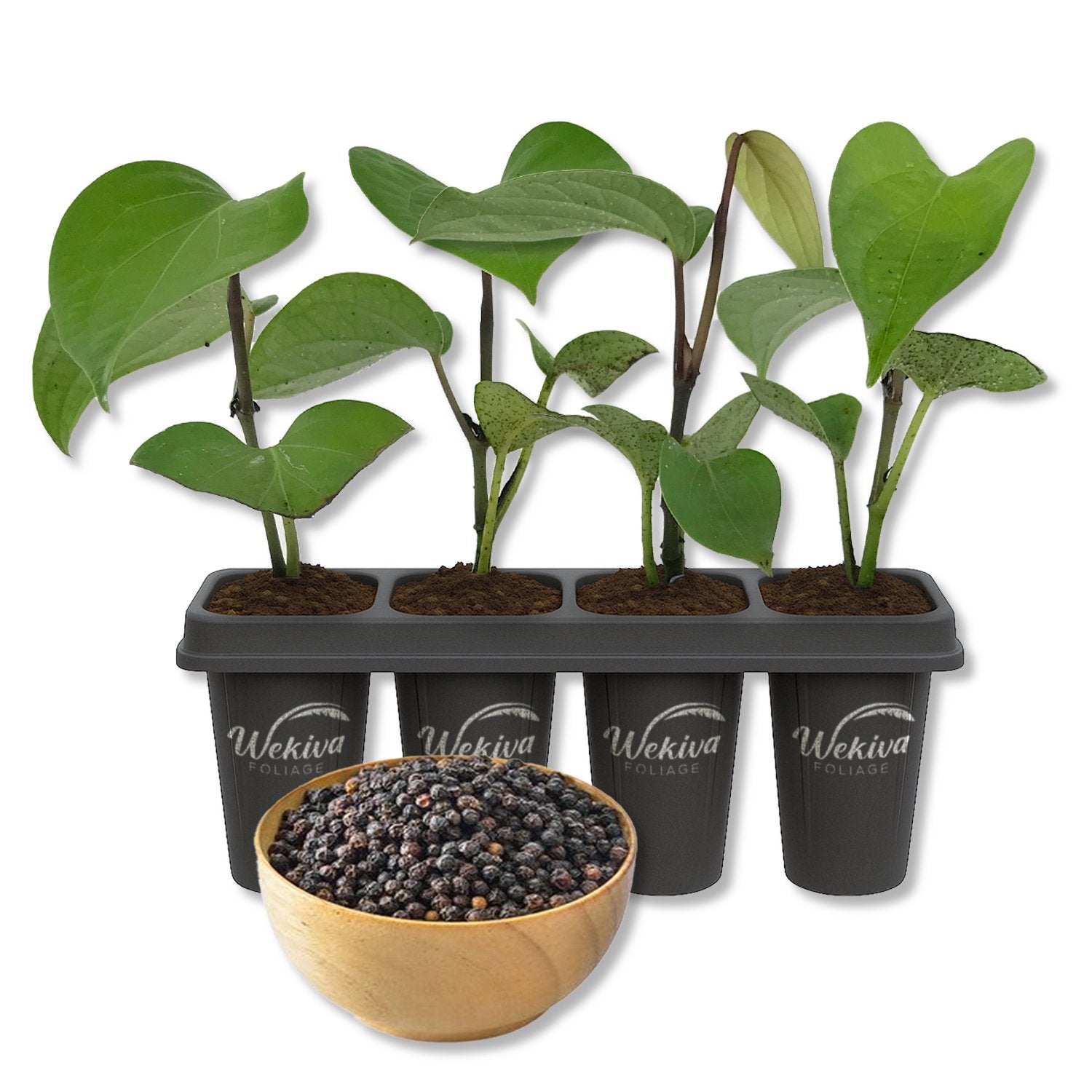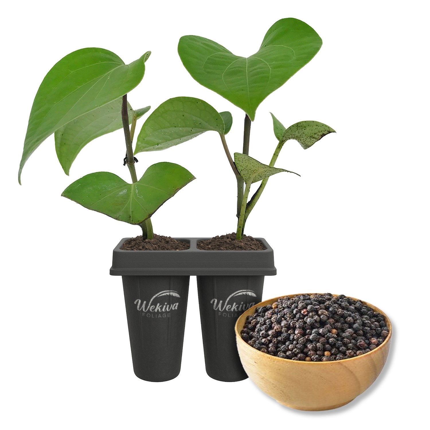 The Black Pepper Plant (Piper nigrum) is a tropical climbing vine cherished for producing one of the world’s most prized spices—peppercorns. This lush evergreen grows with glossy, heart-shaped leaves and long, slender spikes of tiny white flowers that develop into green berries, eventually maturing into the aromatic black, white, or red pepper used in kitchens worldwide. When grown in a warm, humid environment with filtered sunlight, it becomes a striking ornamental and productive addition to patios, greenhouses, or indoor spaces. Its trailing and vining nature makes it ideal for trellises, poles, or hanging supports, where it can reach impressive heights while showcasing its vibrant foliage.