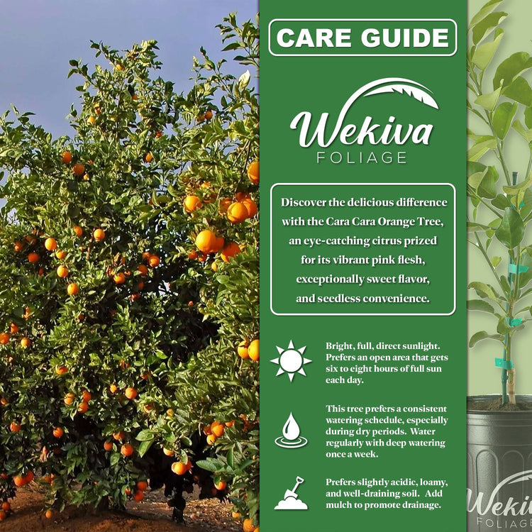 Physical Characteristics: The Cara Cara Navel Orange Tree features glossy, dark green leaves and bears fragrant white flowers followed by round, medium-to-large fruits with a bright orange rind and deep pink, seedless interior flesh. Its compact growth makes it ideal for small spaces or decorative containers.Sunlight Requirements: Provide full sun exposure for best fruit production—at least 6 to 8 hours of direct sunlight daily. Position outdoor trees in an open, south-facing location, or place indoor trees near a large, sunny window.Watering Needs: Water regularly to maintain consistently moist but well-drained soil. Allow the top inch of soil to dry slightly between waterings. Avoid overwatering, especially during cooler months or when the tree is dormant.Soil Preferences: Thrives in light, well-draining soil with a slightly acidic to neutral pH. If planting in a container, use a high-quality potting mix designed for citrus or other moisture-retentive but breathable media.Temperature Tolerance: Best suited for USDA Zones 9–11. While mature trees can tolerate light frost, young trees should be protected from cold temperatures below 32°F. Container-grown trees can be moved indoors during winter in colder climates.