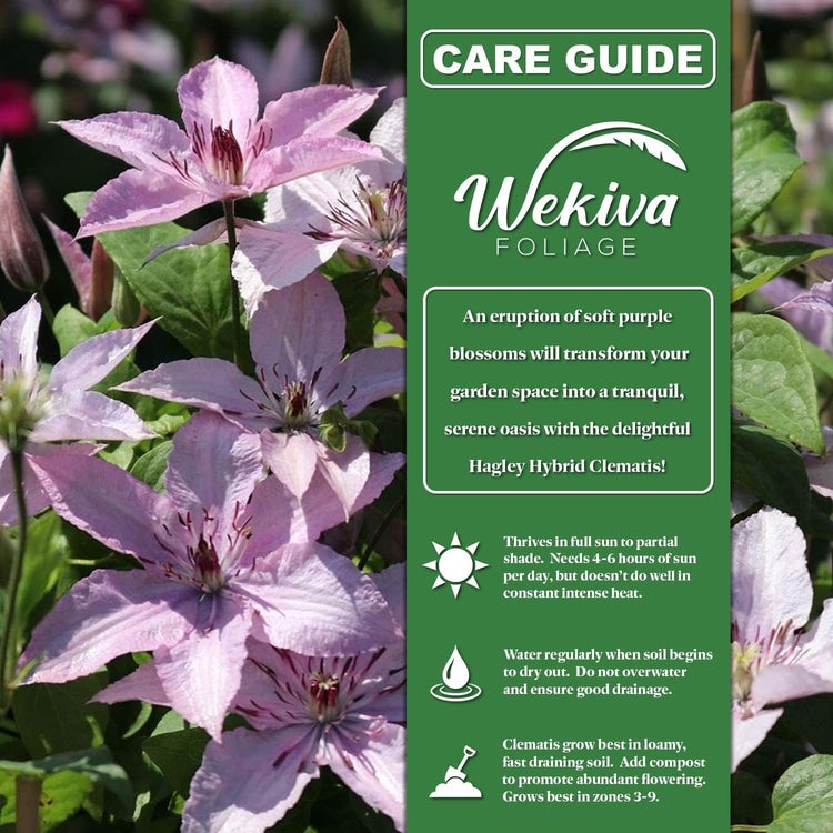 - 'Hagley Hybrid' features profuse, showy, eight-sepaled, 6-8" diameter, white flowers with purplish brown anthers cover this vine in summer. Bloom on this cultivar comes primarily from the previous year's stems in early summer, but also occurs in a second flush later in the summer on the new (current year's) growth.