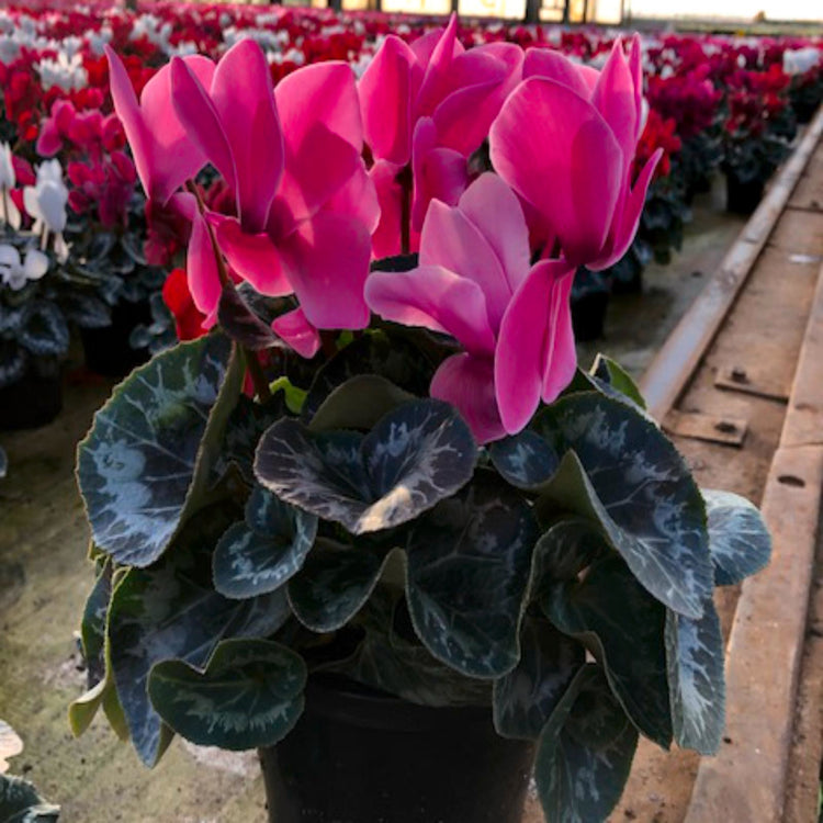- Its flowers come in shades of pink, purple, red, and white. And its heart-shaped leaves are medium green, often with silver marbling. It's commonly grown as a houseplant and is especially popular during the winter holiday season when you can find cyclamen blooming on shelves in garden centers and grocery stores.