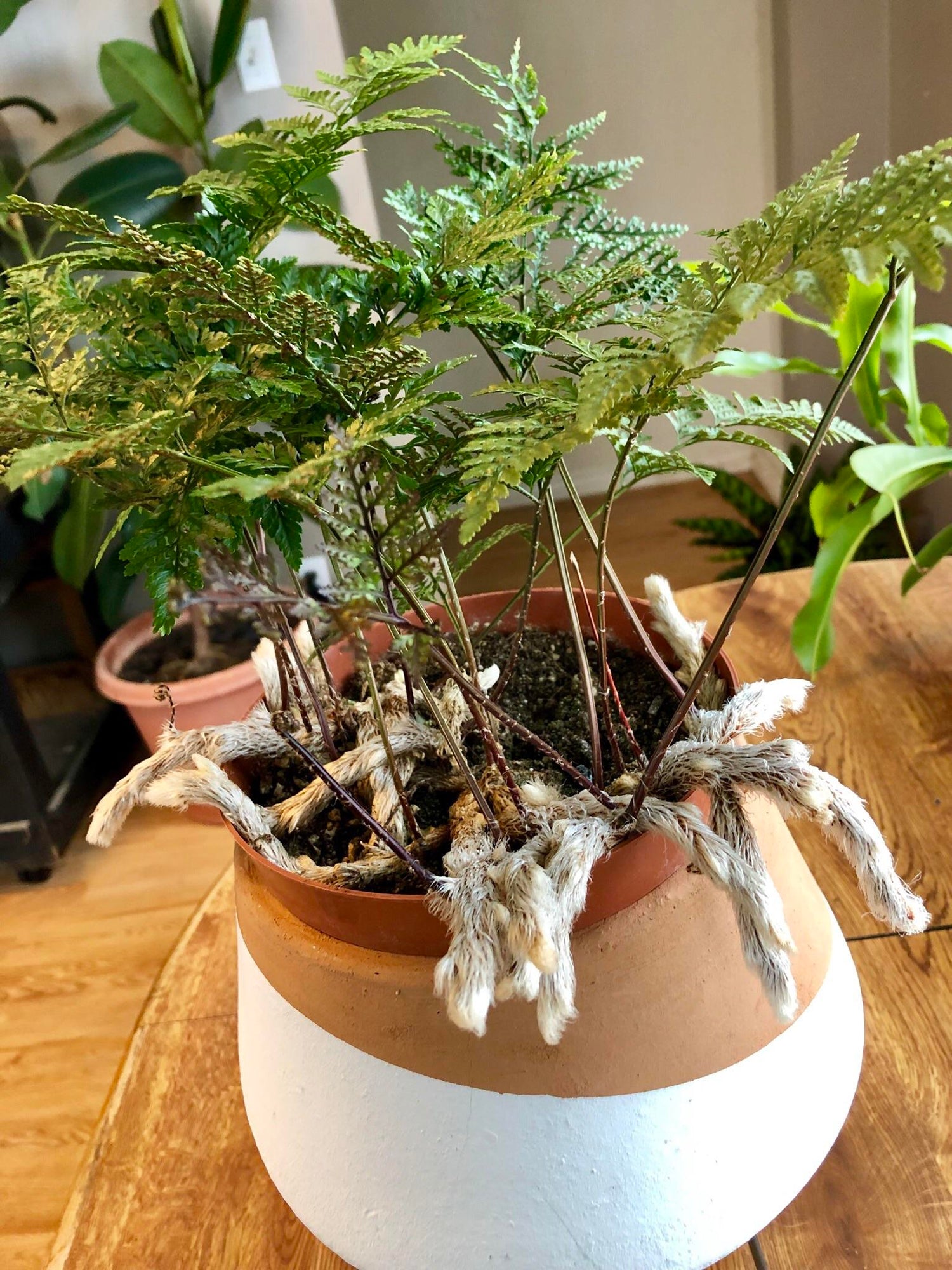 - Packaged and shipped exclusively by Wekiva Foliage. The Davallia genus of ferns includes about three dozen species of ferns that all share a quirky and kind of delightful trait: they all grow from creeping rhizomes that are fuzzy and covered with a fine, fur-like mat of hairs. This fuzzy rhizome has earned the Davallia species their common names: deer's foot ferns, squirrel's foot ferns, and rabbit's foot fern, among others.