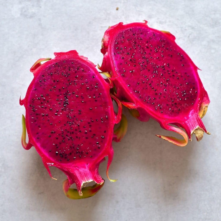 - Dragon fruit is a fruit with tiny black seeds and vibrant pink skin. Each fruit weighs between 150-600g and is commonly used in fruit salads, smoothies and salads. It has little flavour and its texture closely resembles that of kiwi fruit. To prepare all you to do is to cut the fruit in half and then scoop out the flesh.