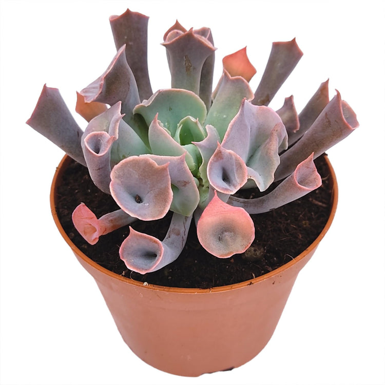 - Rosette Formation: The Echeveria 'Pink Trumpet' forms a compact rosette of fleshy, smooth leaves that are shaped like a trumpet, which gives the plant its name. The rosette typically grows to about 6 inches in diameter, making it a perfect size for small pots or garden arrangements.