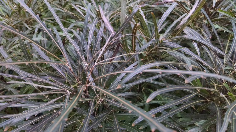- False aralia (Dizygotheca elegantissima), also known as spider aralia or threadleaf aralia, is grown for its attractive foliage. The long, narrow, dark green leaves with saw-tooth edges are coppery colored at first, but as they mature they turn dark green, appearing almost black on some plants.