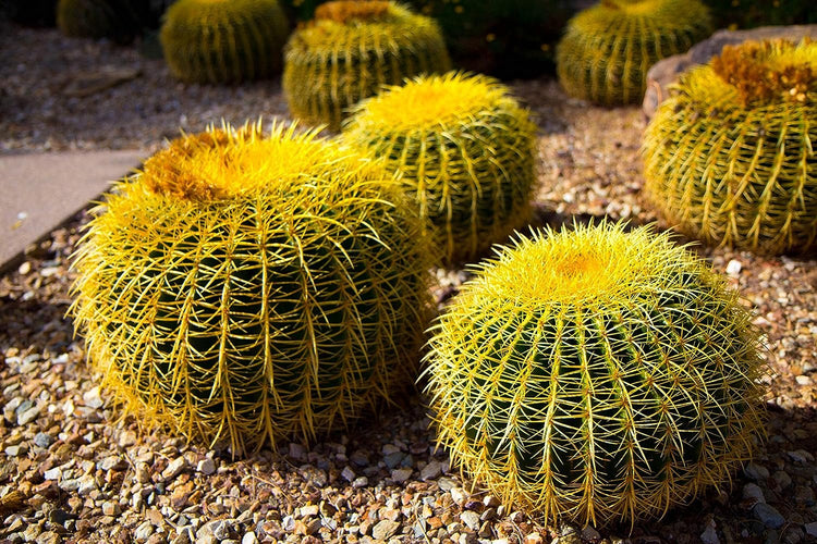 A must in any desert landscape! Golden spines line the ribs of this globe shaped cactus, with the top adorned by bright yellow flowers emerging from a patch of wool. A great addition to any desert, succulent or xeriscape garden. Plant these in mass for a dramatic, yet whimsical effect or set in groups amidst other drought tolerant succulent and cactus varieties. These stunning yellow globes will add an architectural interest to your garden or container planting. Perfect for flat desert landscapes because their clustering habit leads the eye to believe your garden has rolling hills. Although this plant does have golden spines along its ribs, they are gently curved, giving it the amusing nickname of Mother-In-Law's Cushion. Follow a regular watering schedule during the first growing season to establish a deep, extensive root system. Watering can be reduced after establishment.