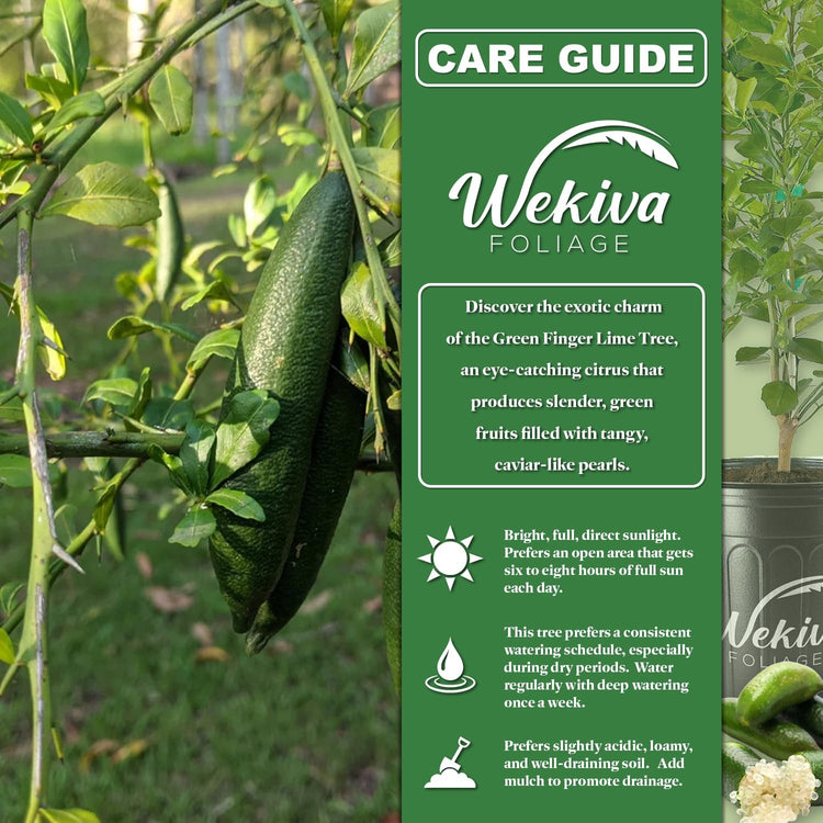 - Sunlight Requirements: The Green Finger Lime thrives in full sun but can also tolerate partial shade. For optimal fruit production, place the tree in a location where it receives at least 6 to 8 hours of direct sunlight per day, whether planted outdoors or kept in a bright indoor space near a south-facing window.