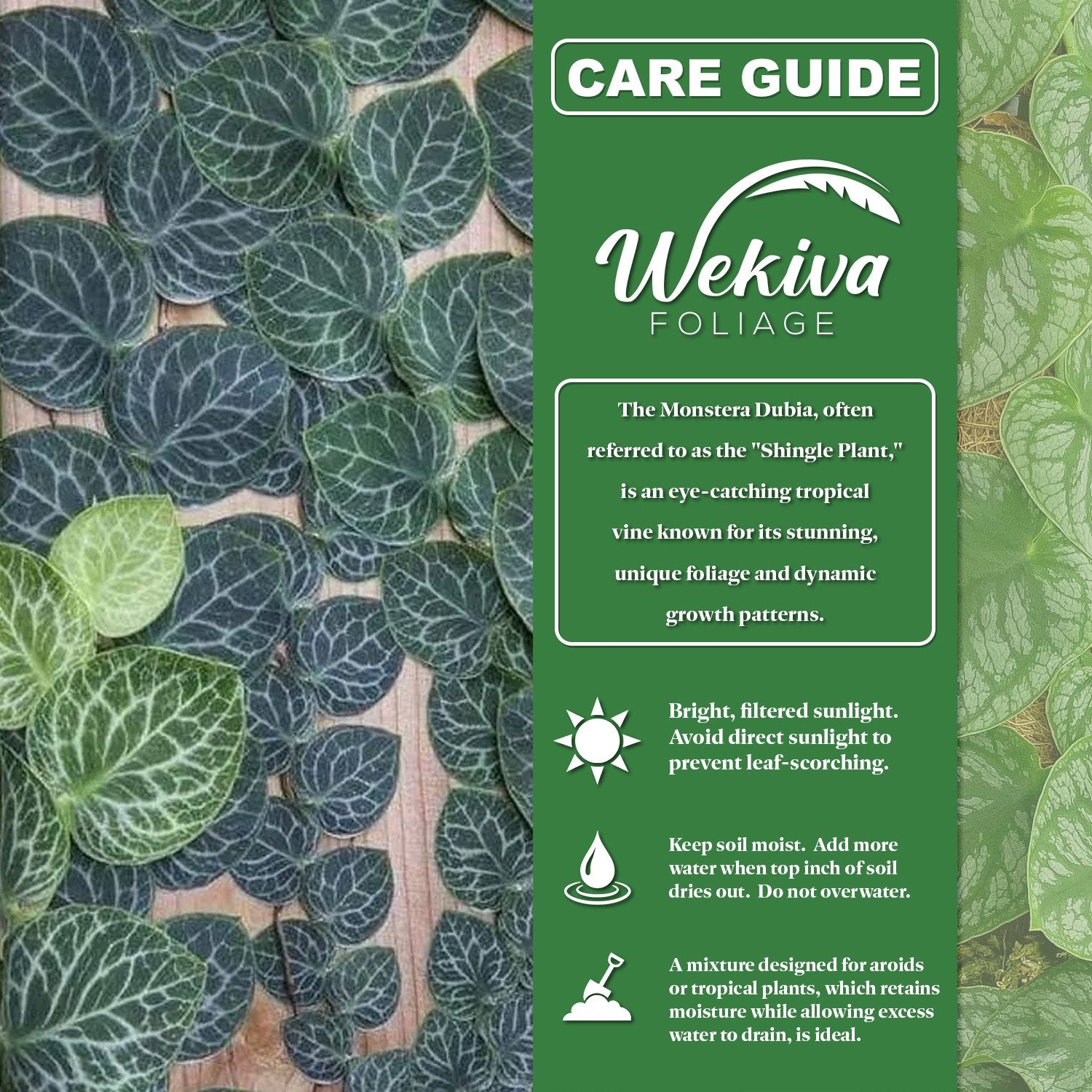 - Physical Characteristics: The Monstera Dubia is distinctive for its heart-shaped leaves, which are initially smooth and gradually develop into larger, intricately lobed shapes as the plant matures. The plant’s climbing nature makes it an ideal option for creating a lush, vertical garden.