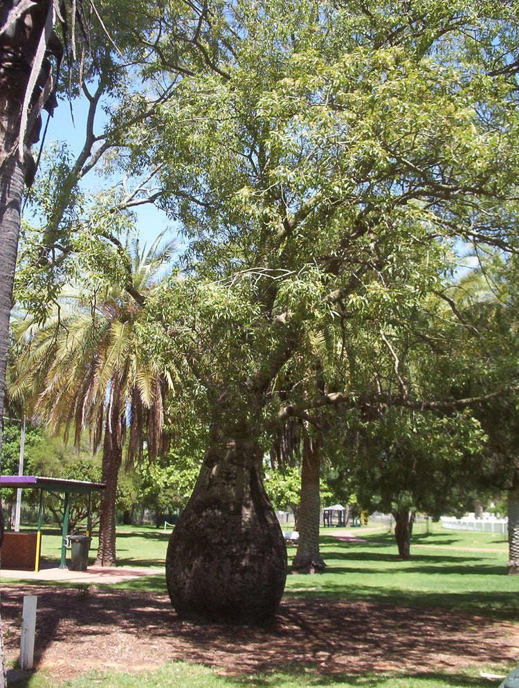 - When planted outside in warm zones, the truck remains straight with thin palmate leaves, and over many years it swells into the shape of a bottle. Australian Bottle Tree is a resilient plant tolerating dry conditions and a cramped root system. The older leaves fall in the spring as the new growth starts.