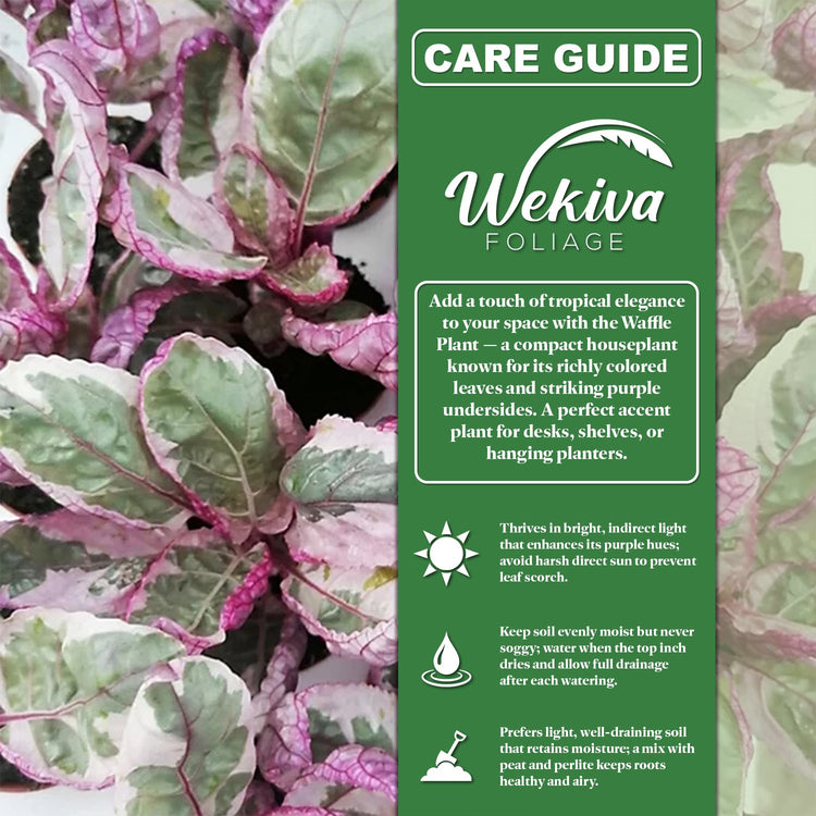 Physical Characteristics: Compact in size, the Snow White Waffle Plant typically grows 6 to 12 inches tall with a spreading or trailing habit. Its textured, crinkled leaves display a captivating blend of green, white, and soft pink shades, creating a lively contrast in any display. With its bushy form and cascading growth, it is equally stunning in containers, hanging baskets, or as an accent plant.Light Requirements: The Snow White Waffle Plant performs best in bright, indirect light, where its colorful variegation is most pronounced. It can also adapt to medium or lower light settings, though its foliage may show deeper green tones with less pink and cream. Avoid prolonged direct sun, as intense rays can scorch or fade its delicate leaves.Watering Needs: This plant prefers evenly moist soil, so regular watering is important to maintain its vibrant foliage. Allow the top inch of soil to dry before watering again, and reduce watering during cooler months when growth slows. Maintaining a consistent schedule helps prevent stress and supports lush, compact growth throughout the year.Soil Preferences: A well-draining, nutrient-rich potting mix is best for the Snow White Waffle Plant. Soil that holds some moisture while still allowing excess water to escape is ideal. Using a high-quality potting blend with added perlite or coarse material ensures proper aeration, reducing the likelihood of waterlogged conditions while supporting steady root development.Temperature and Humidity: This tropical plant thrives in average indoor temperatures and enjoys slightly higher humidity levels. It adapts well to standard household conditions but appreciates environments with consistent warmth and moderate moisture in the air. Protecting the plant from drafts or sudden temperature fluctuations will help keep its foliage healthy and attractive.
