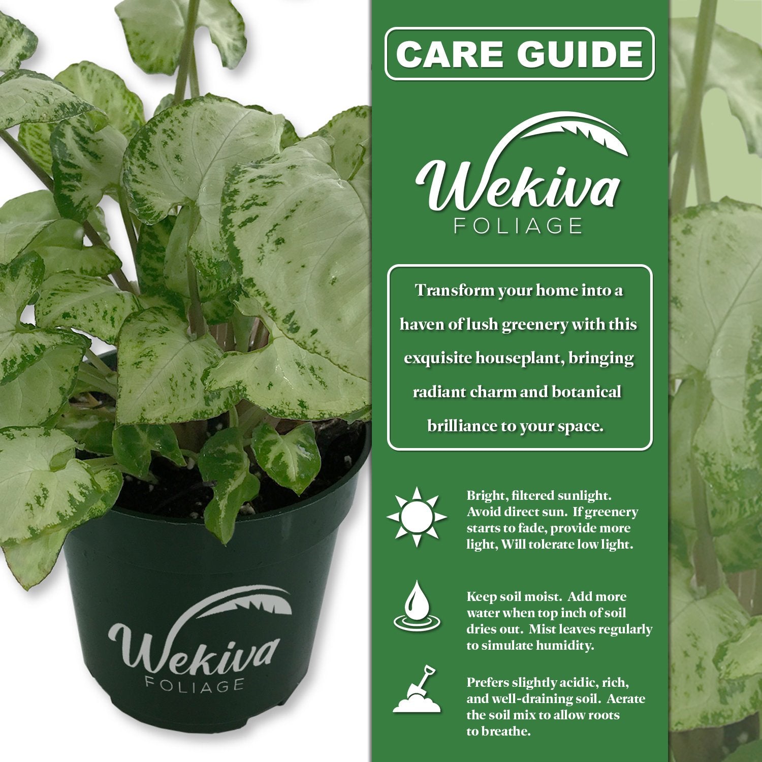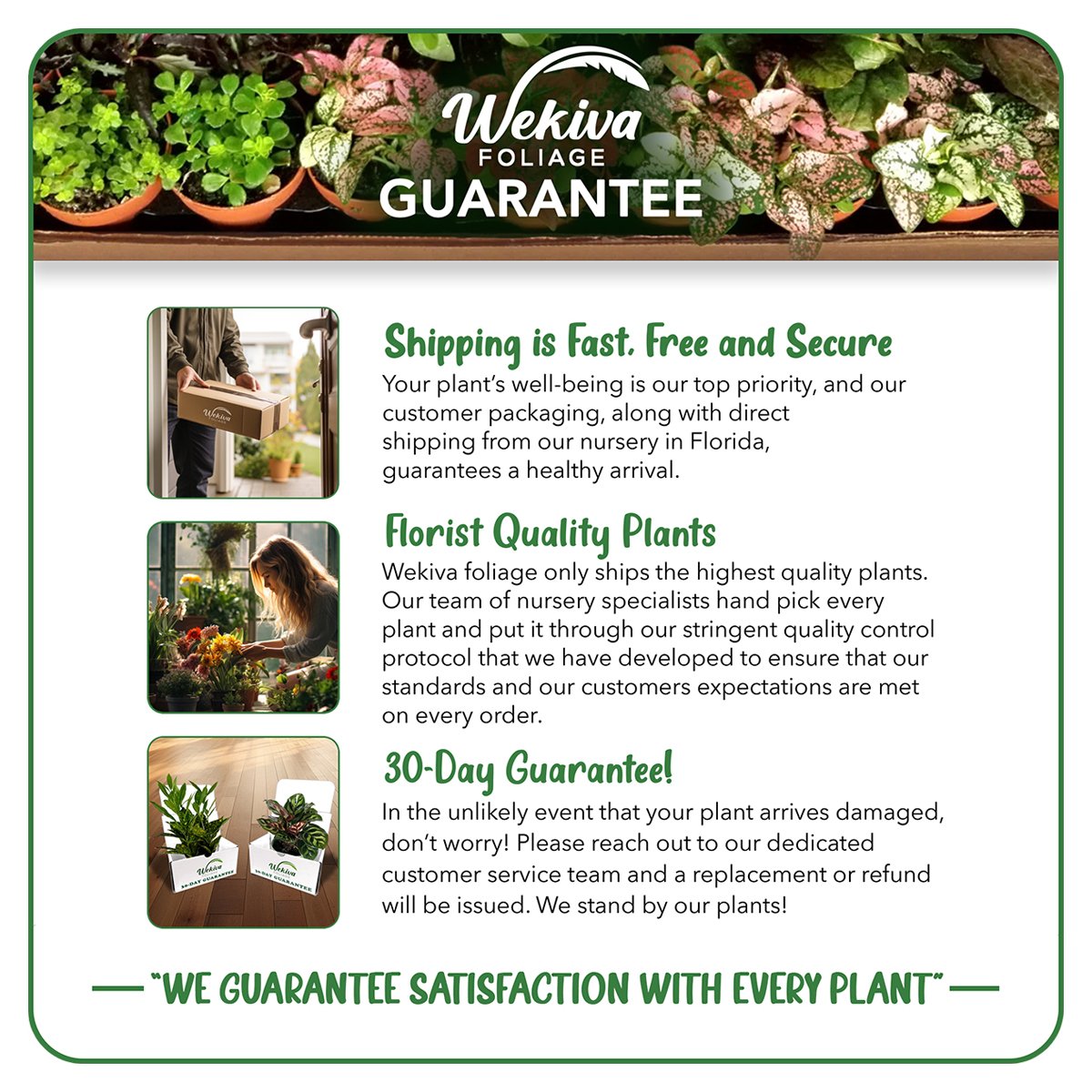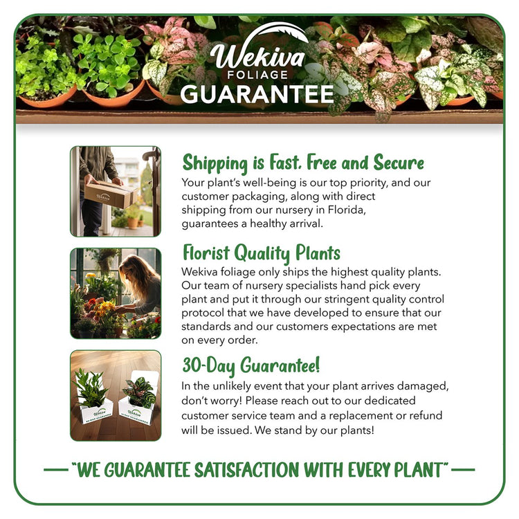 All Wekiva Foliage plants come with a 30 day warranty. If your plant is damaged during delivery, please contact us within 48 hours.
