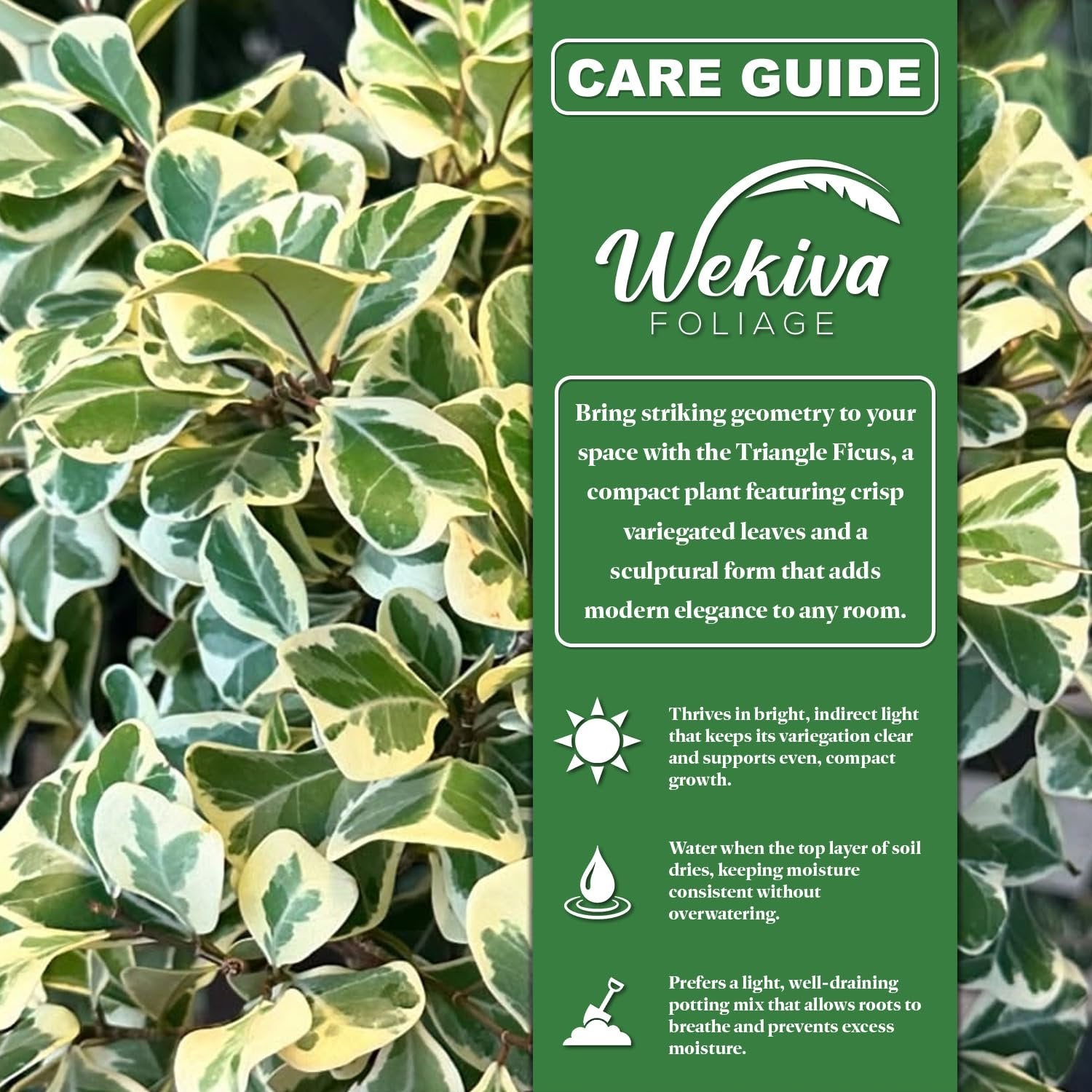 The Triangle Ficus is a standout foliage plant admired for its distinctive, geometric leaves that create a striking architectural presence in any indoor space. Also known as the Variegated Triangle Fig, this variety showcases creamy white and soft green marbling, with each leaf shaped like a small triangle—giving the plant its unmistakable identity. Its upright, branching habit allows it to develop a full, layered canopy, making it ideal for bright interiors where its colors and structure can be fully appreciated. The plant maintains a naturally tidy silhouette, allowing it to serve as a focal point on a tabletop, plant stand, or decorative corner. Because of its compact growth pattern and elegantly patterned foliage, it is often selected for modern décor themes that highlight clean lines and sculptural greenery.