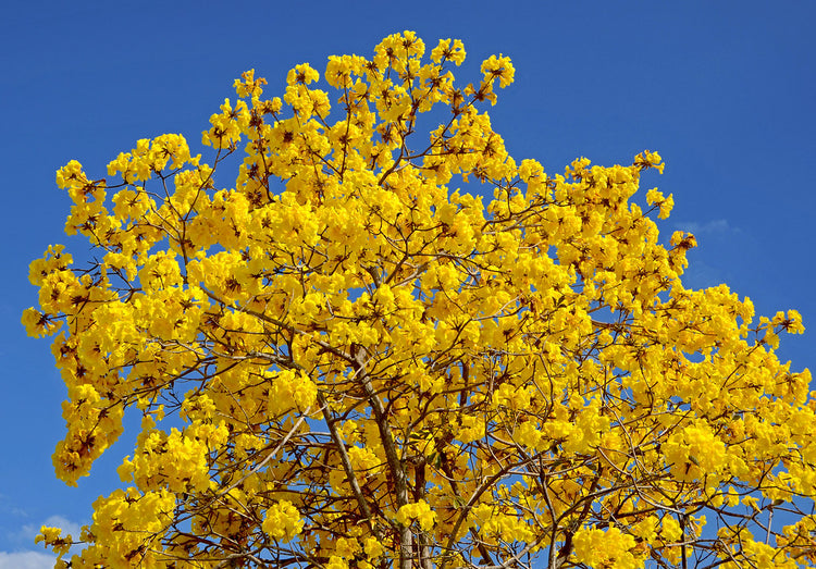 - Sometimes evergreen but most often deciduous, golden trumpet tree has four-inch-long silvery leaves with tan, fuzzy undersides. These leaves drop for a short period in April to May, and it is at this time that the trees put on their heaviest flowering display, the trumpet-shaped, bright yellow blossoms appearing in clusters.